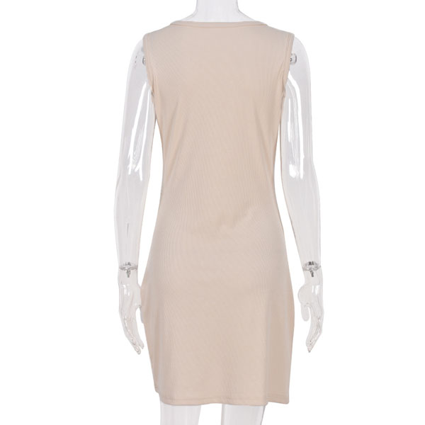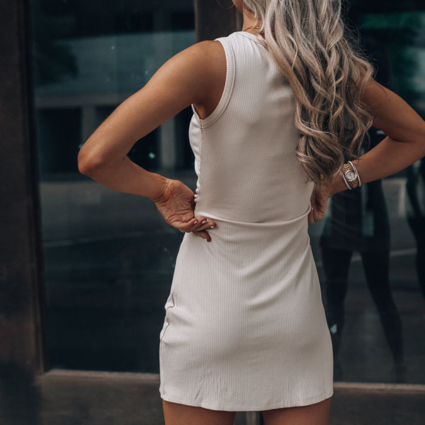 When the summer season hits,this sleeveless dress is worth to have a place in your wardrobe. Crafted in a solid color,with sleeveless,round neck and a fit silhouette,this dress is sure to showcase your slender figure. Moreover,the slit hem design will lend you a dash of sexy and flirty vibes. This dress which can be fit for different occasions is worth to arouse your attention.