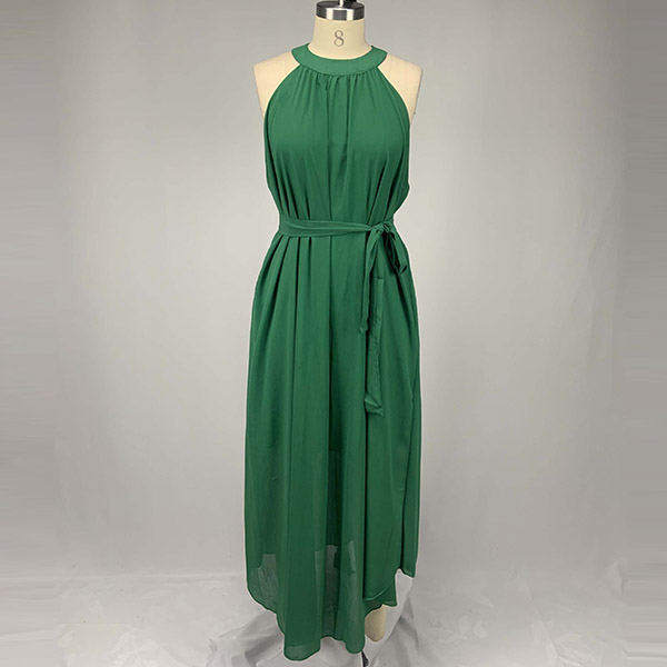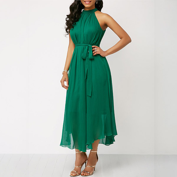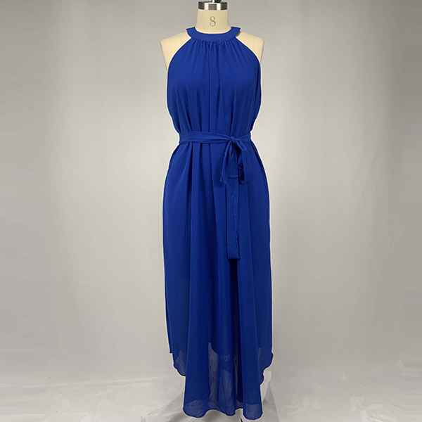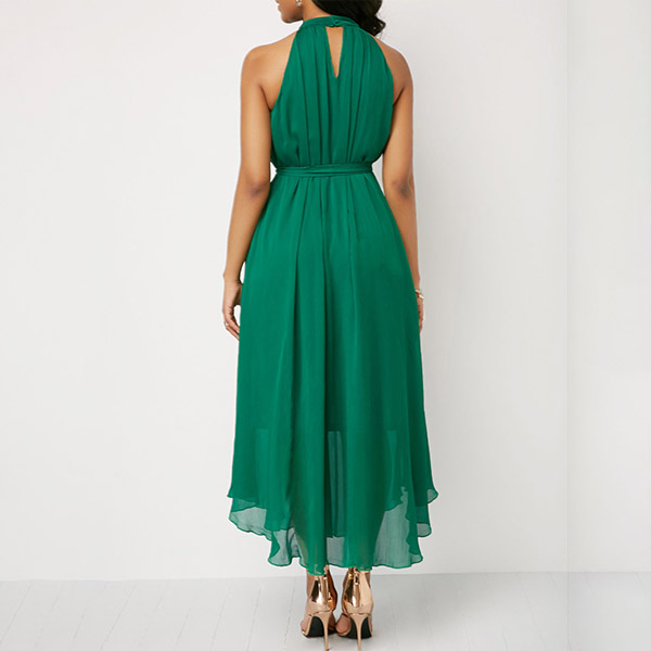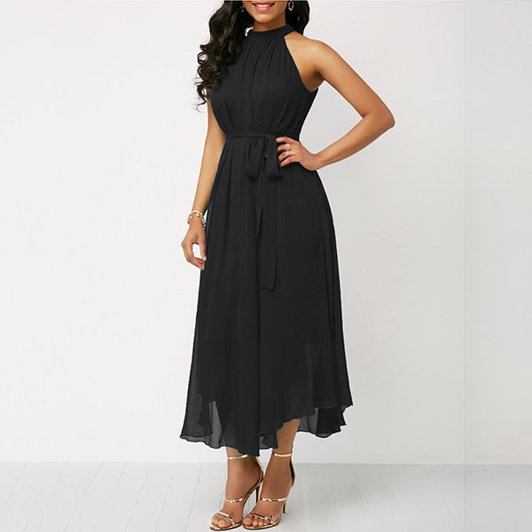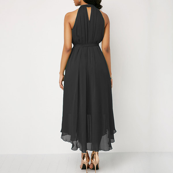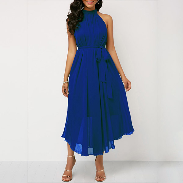 This is a beautiful and stylish dress that is perfect for any formal or casual occasion. The dress is sleeveless with a halter neckline and has an irregular hemline. The dress is made from a soft and comfortable material that is perfect for any body type.
