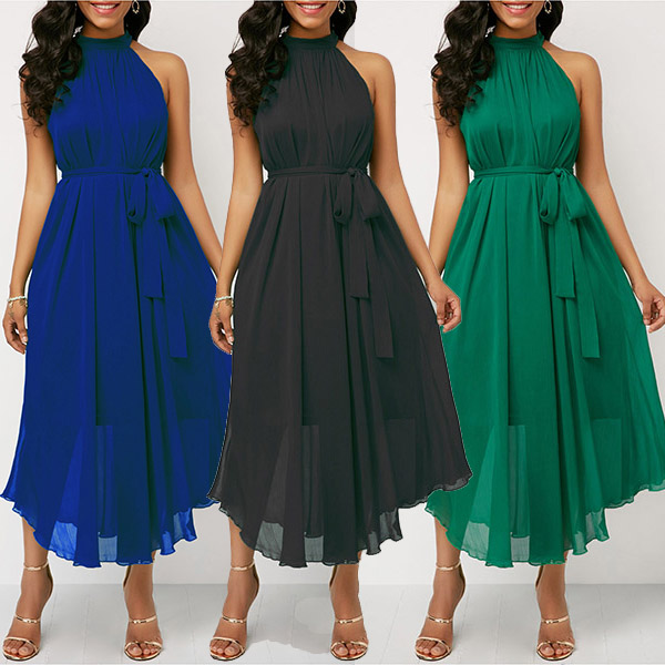 Fashion Solid Color Sleeveless Self-tie Irregular Hemline Halter Dress