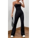 This black jumpsuit features a solid color design, sleeveless silhouette, and straight-cut fit for a fashionable and effortless look.