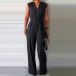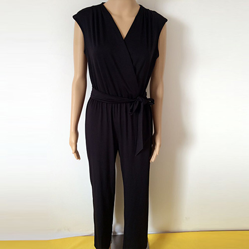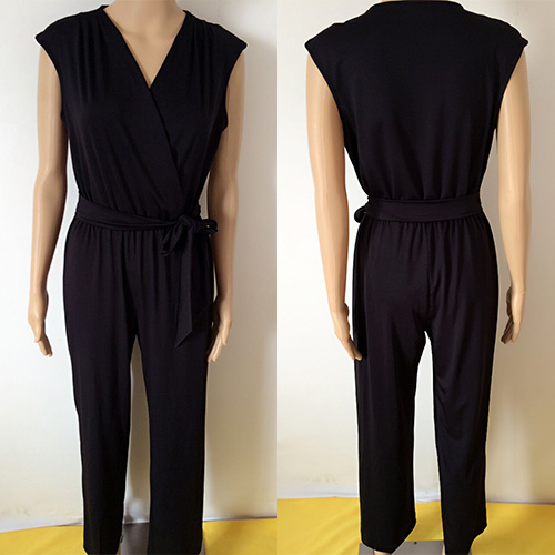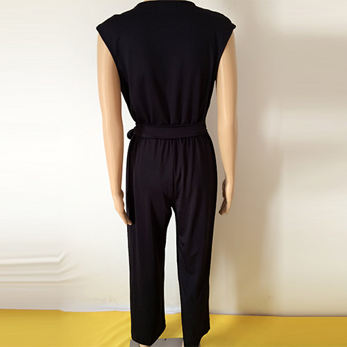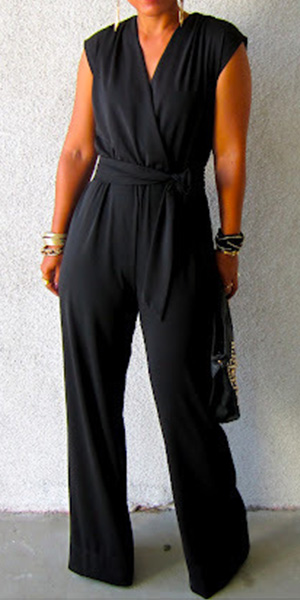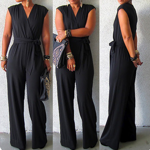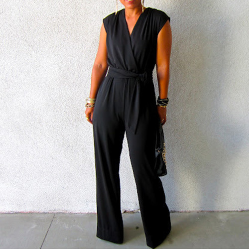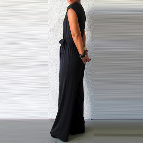 This jumpsuit features mysterious and flattering black color,with sleeveless,v-neckline and