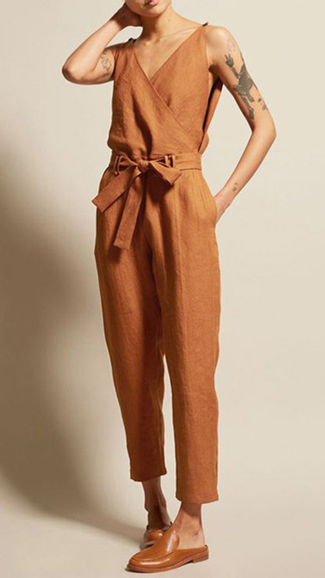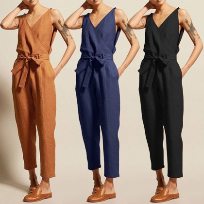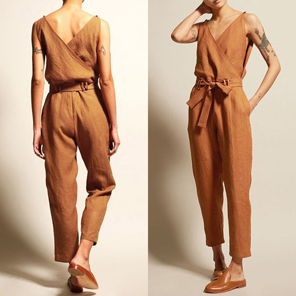 How can you not have a pair of Jumpsuit in summer? This piece boasts a solid color,the v-neck design can help enhance the feminine appeal,while the high waist and lace-up design at the waist part can better showcase your slender figure. When you wanna update your style,you can just have a try this piece.