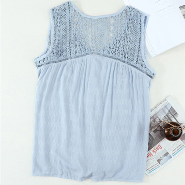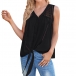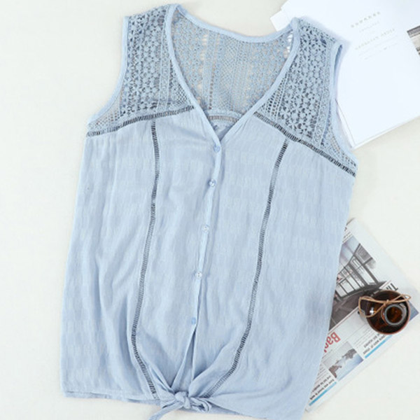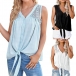 Fashion Solid Color Sleeveless V-neck Knotted Hem Lace Spliced Top