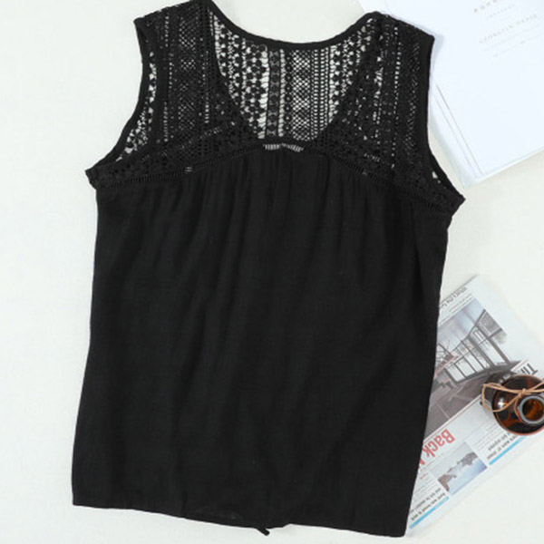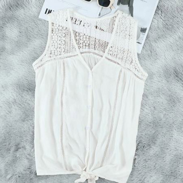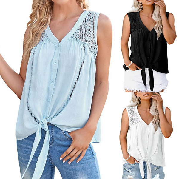 Comes with a solid color,finished with sleeveless,v-neck and soft fabric,this piece knows how to give you a comfortable day. Moreover,the lace spliced details and knotted hem design will further enhance its entire charm. Attracted? Then buy one!