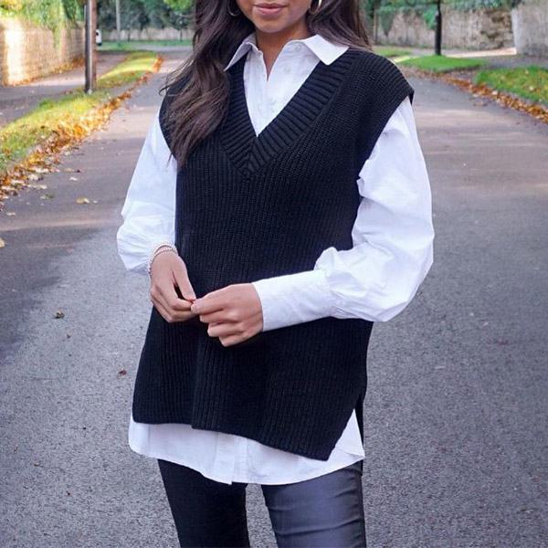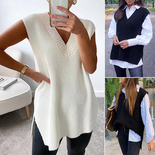Fashion Solid Color Sleeveless V-neck Slit Hem Knit Vest