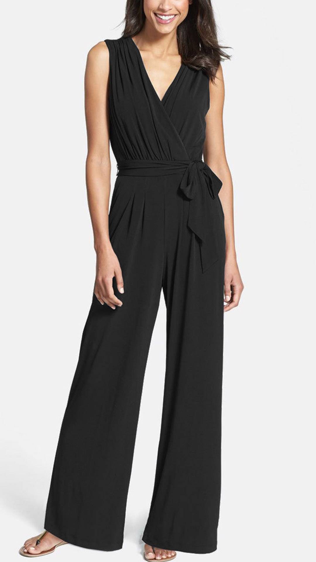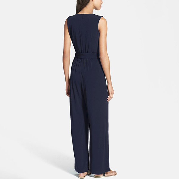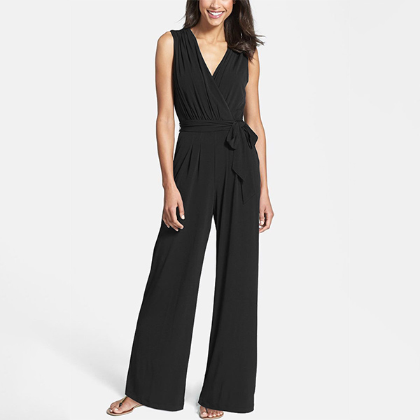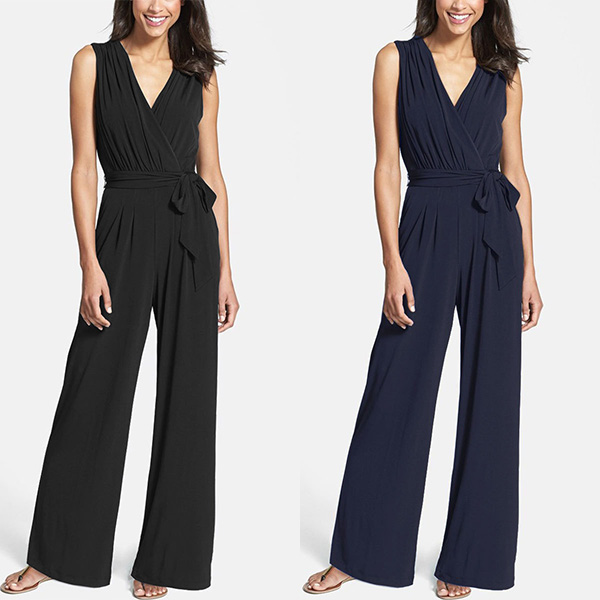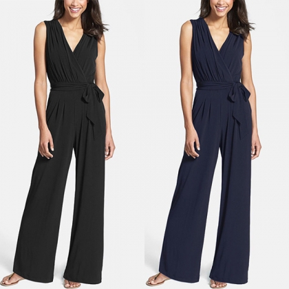 Fashion Solid Color Sleeveless V-neck Tie-belt Wide Leg Jumpsuit