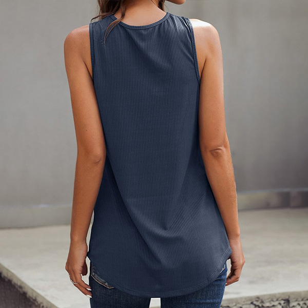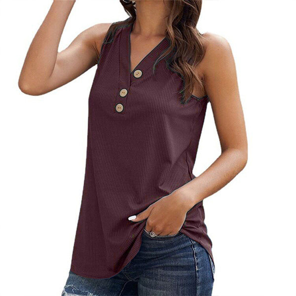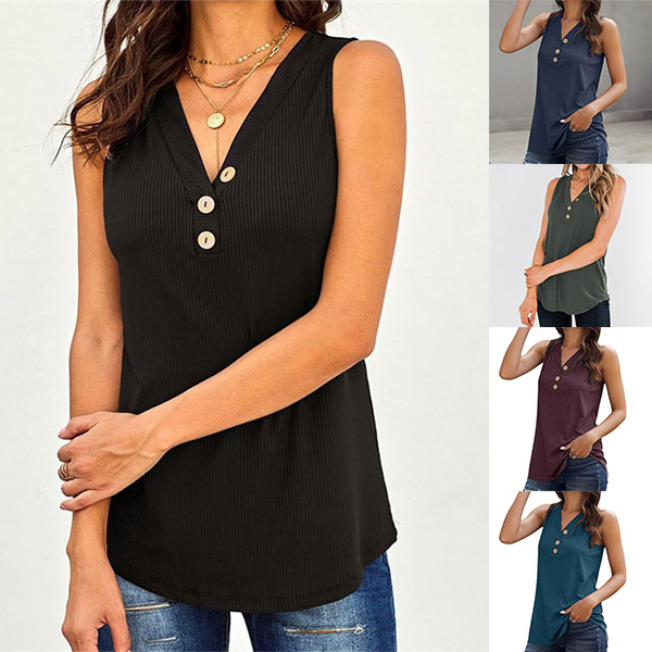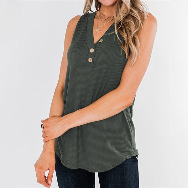 For the hot summer days,this sleeveless top can easily strike your mind. Solid color style,the v-neck and button details at the neckline part will add some extra charm. You can just match it with a shorts to finish a simple yet fashionable summer look.