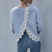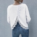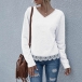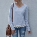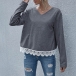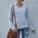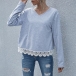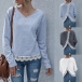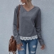 Fashion Solid Color Slit Hem Long Sleeve V-neck Lace Spliced Top