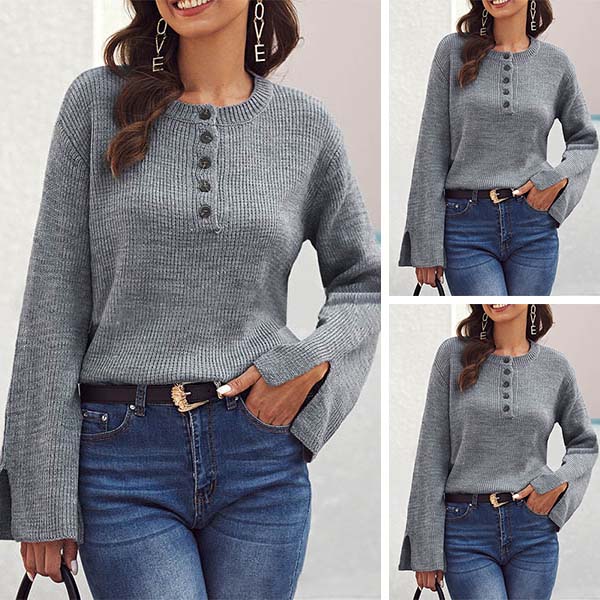 Fashion Solid Color Slit Long Sleeve Round Neck Sweater
