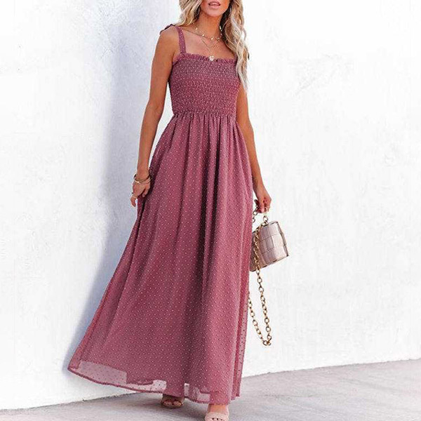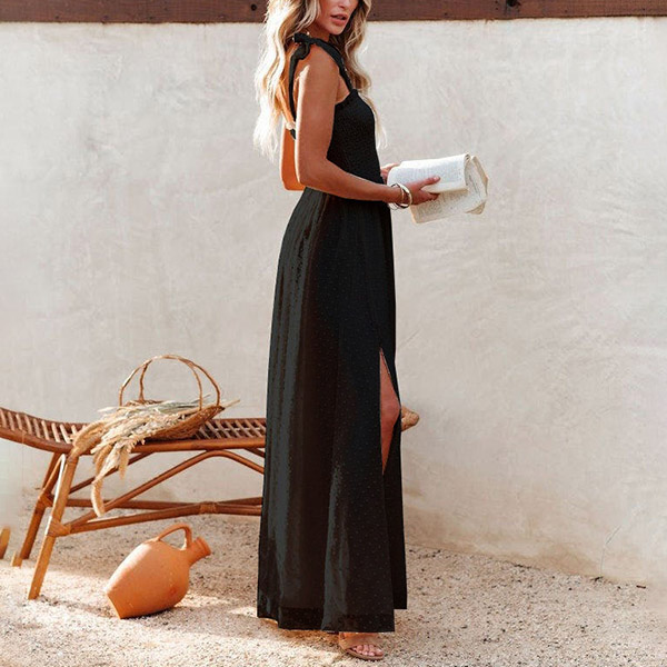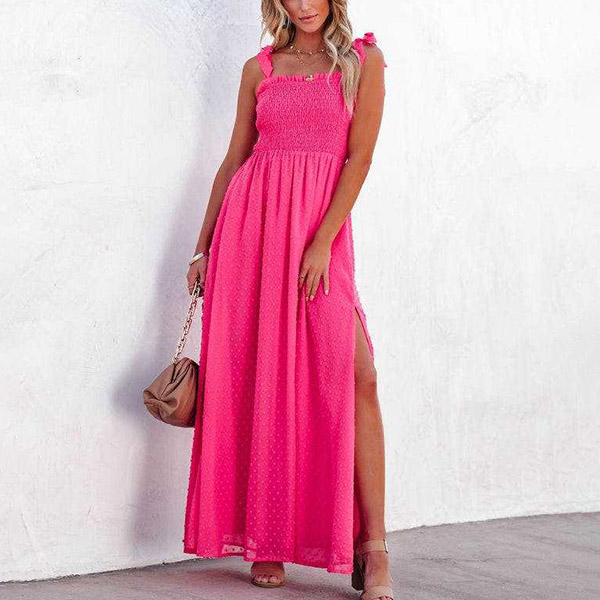 Fashion Solid Color Smocked Swiss-dot Slit Maxi Dress