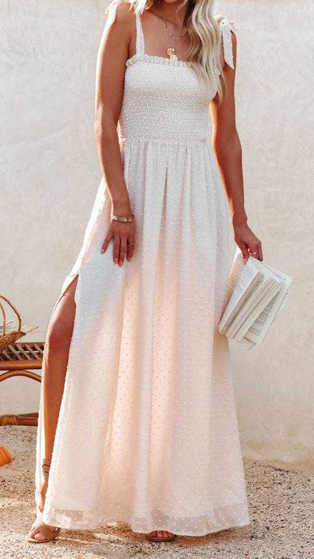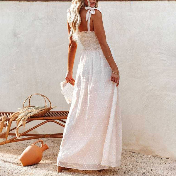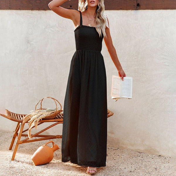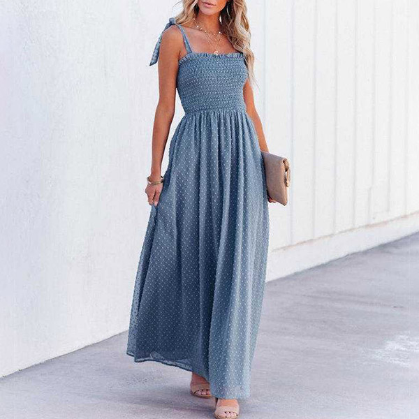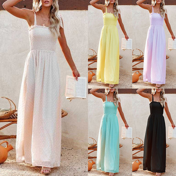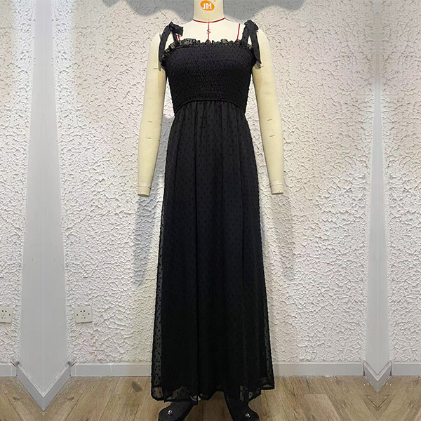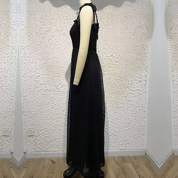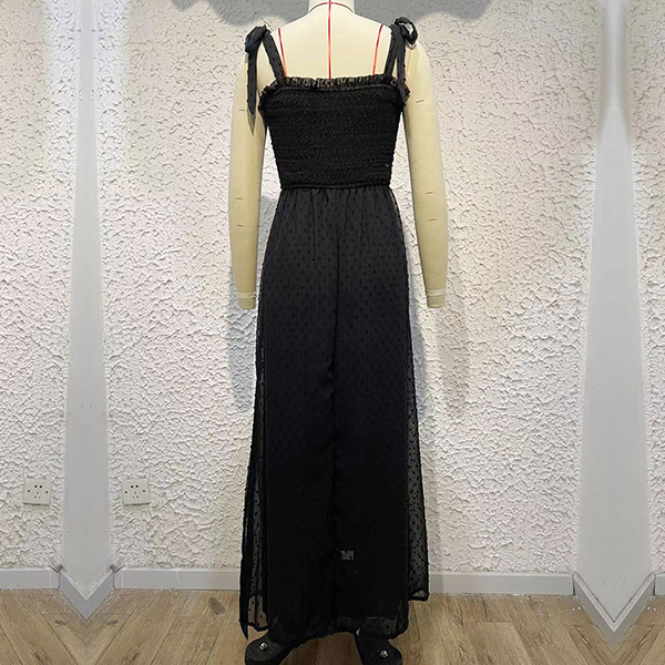 This is a beautiful and elegant dress that is perfect for summer vacation. The dress is made of a high-quality Swiss-dot fabric that is very smooth and comfortable to wear. Self-tie shoulder strap, smocked bodice. maxi length and front slit details.