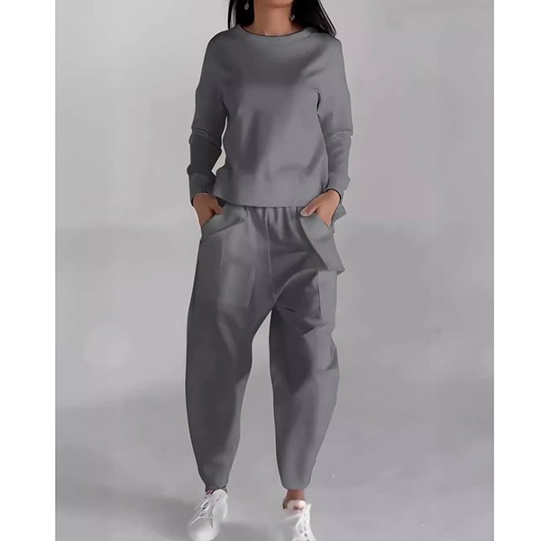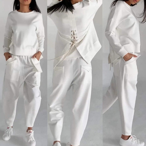 This comfortable sporty set combines relaxed sweatshirt with matching sweatpants in coordinated solid color. Perfect for workout sessions, casual weekends, or comfortable travel wear.
