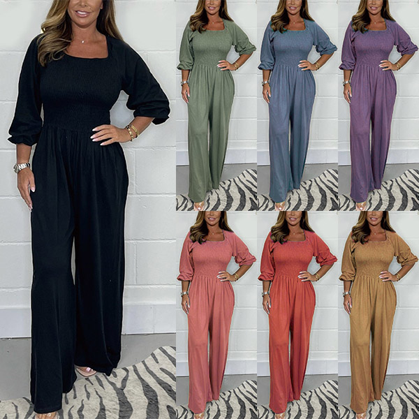 Fashion Solid Color Square Neck Elbow Sleeve Wide-leg Jumpsuit