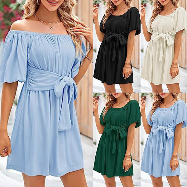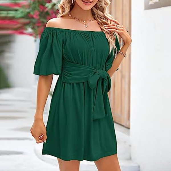 Fashion Solid Color Square Neck Short Sleeve Self-tie Mini Dress