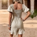 This chic romper features a square neckline and short sleeves, creating a flattering and stylish look. The smocked bodice adds texture and detail, while the pleated shorts give it a fun and flirty vibe. Perfect for a day out with friends or a summer picnic.