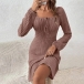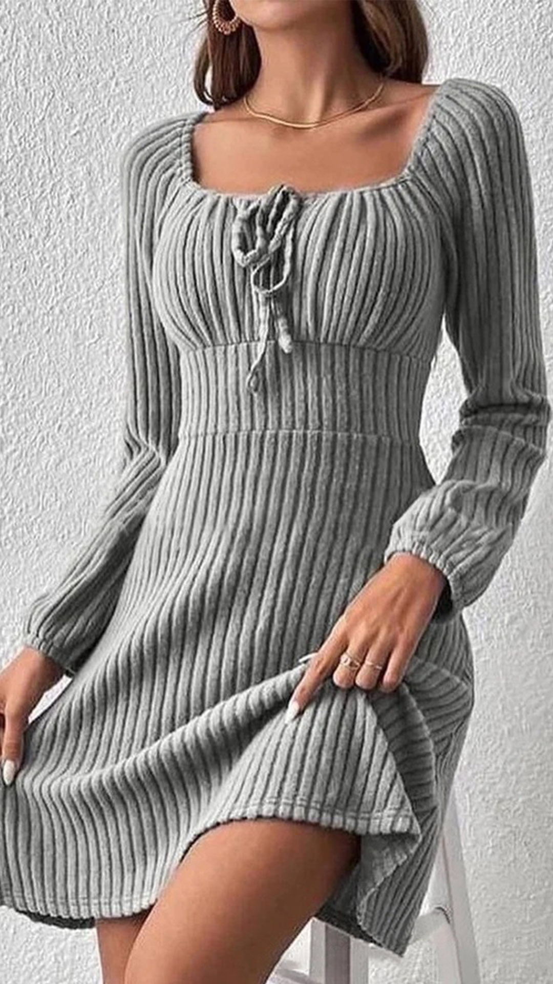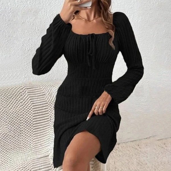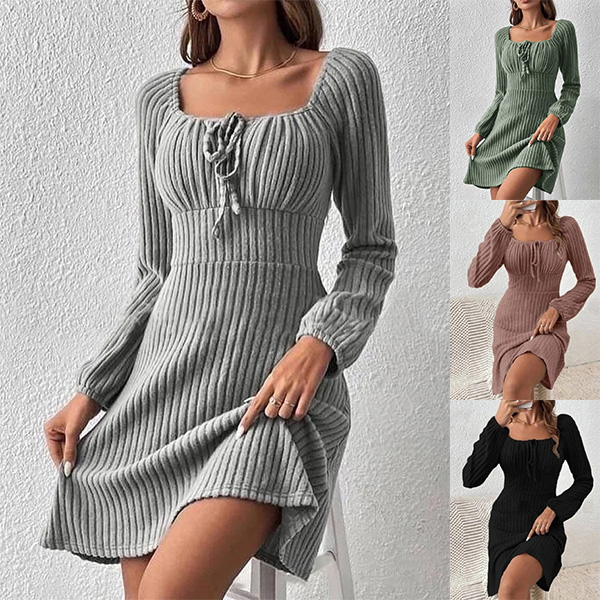 Featuring a square neckline and long sleeves, this dress exudes a chic and sophisticated vibe. The vertical stripes create a visually elongating effect, enhancing your silhouette. Pair it with heels or ankle boots for a polished and elevated ensemble.