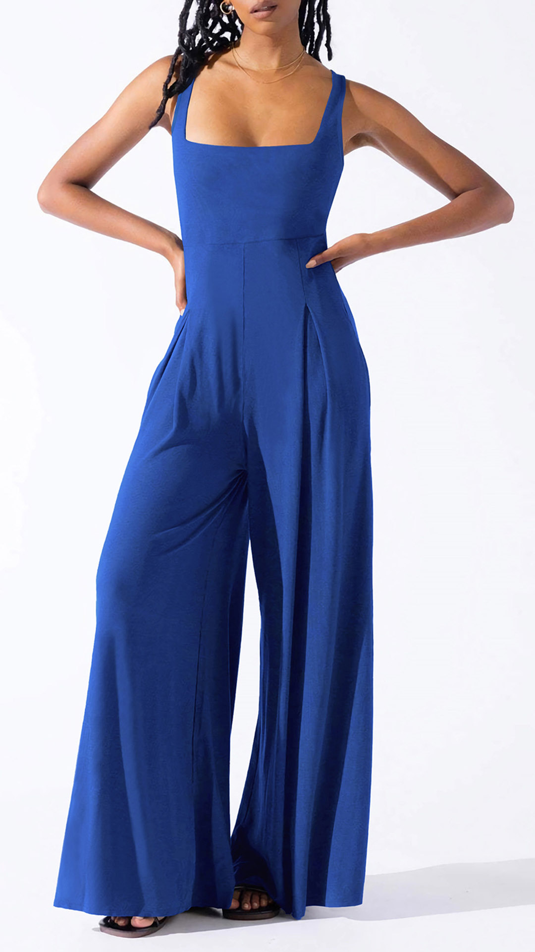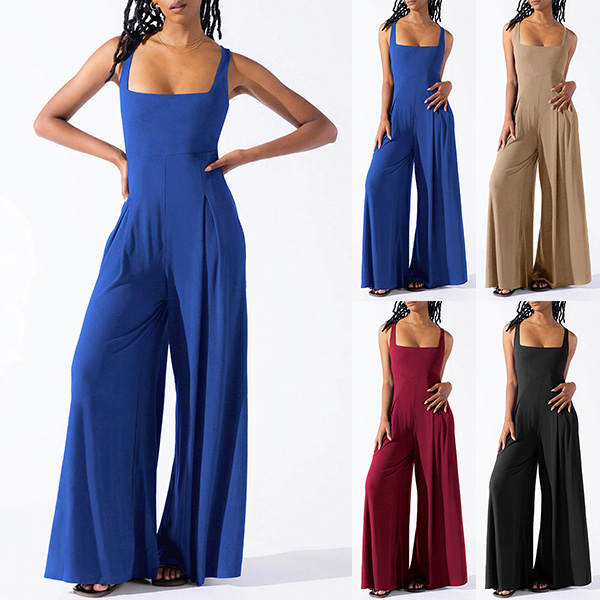 This jumpsuit combines modern fashion with timeless elegance, featuring a sleek solid color design, a flattering square neckline, and wide-leg pants that create a chic and sophisticated silhouette.