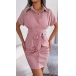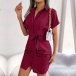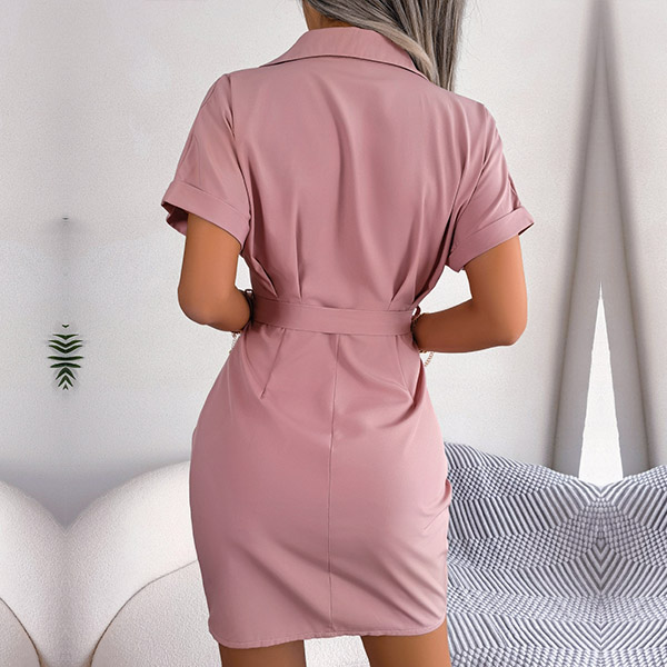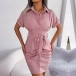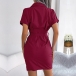 Fashion Solid Color Stand Collar Buttoned Short Sleeve Self-tie Shirt Dress