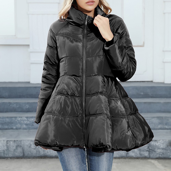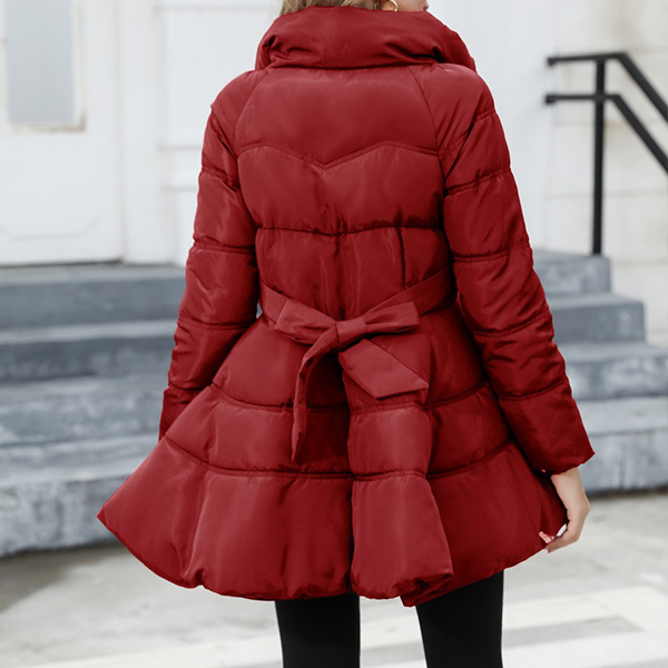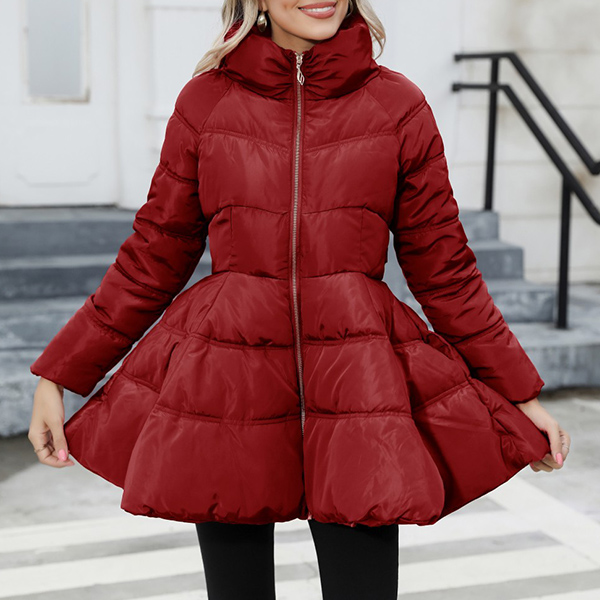 Fashion Solid Color Stand Collar Cinch Waist Ruffled Quilted Jacket