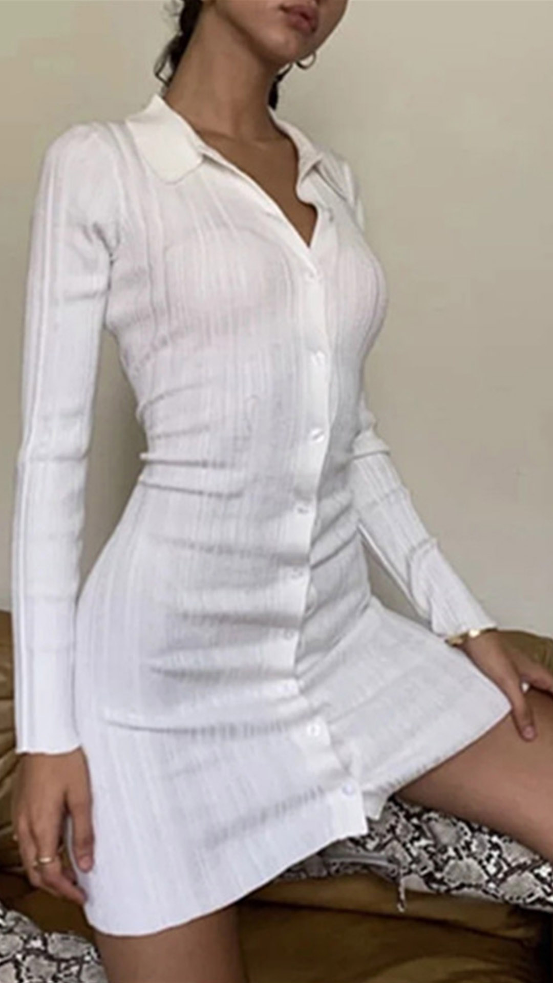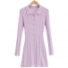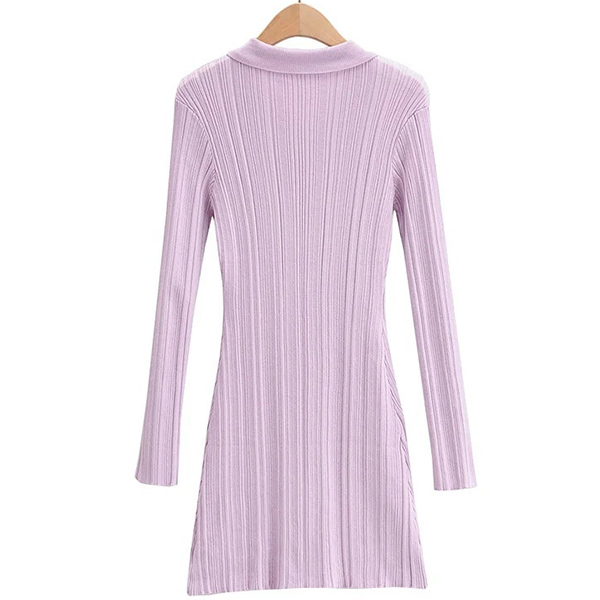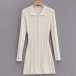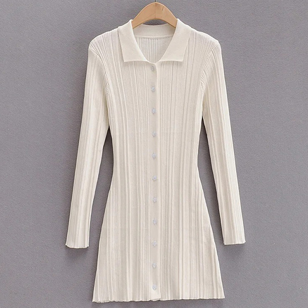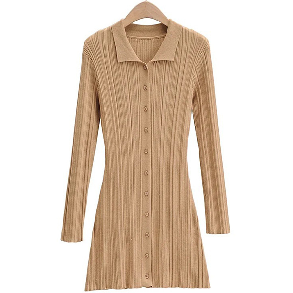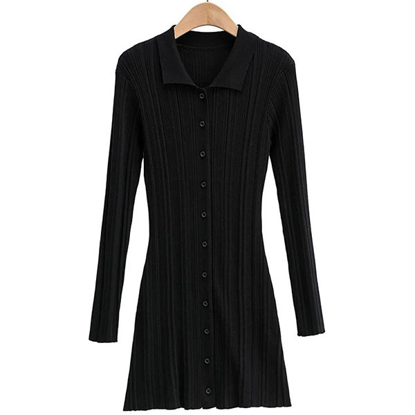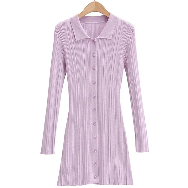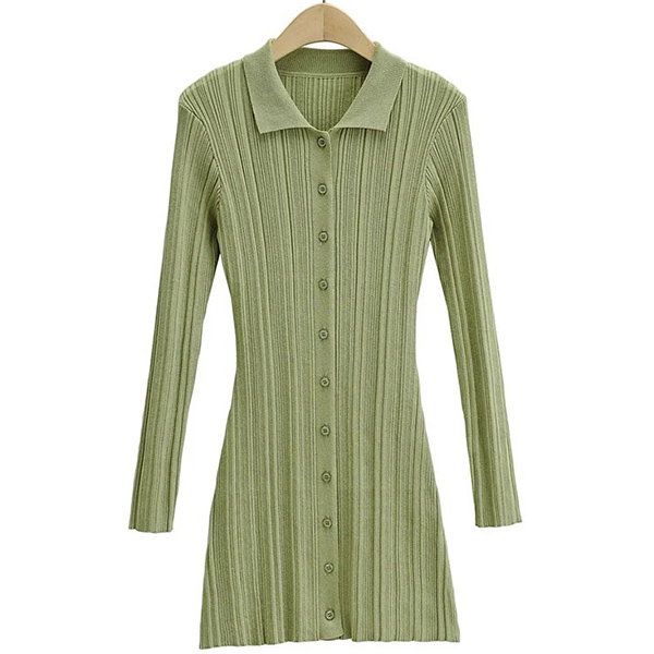 Fashion Solid Color Stand Collar Front Button Long Sleeve Elastic Ribbed Dress