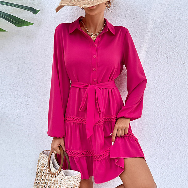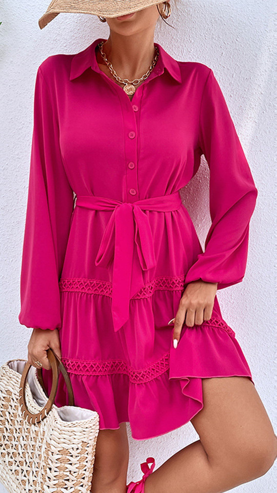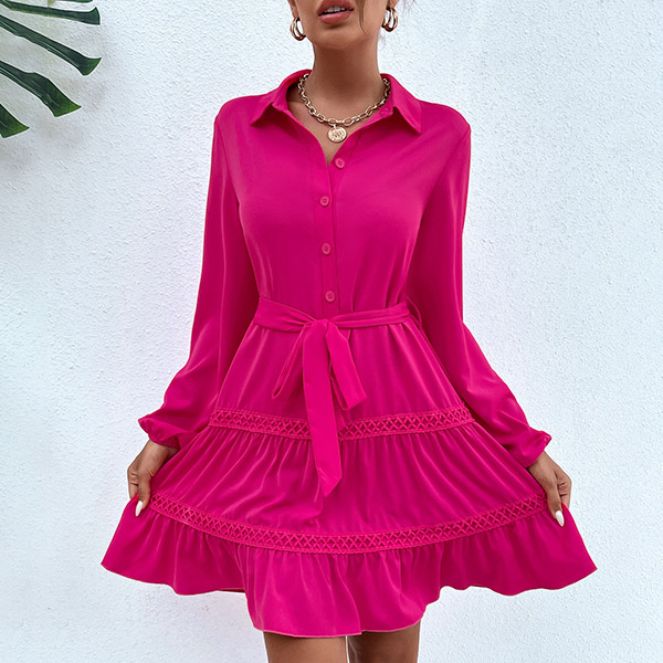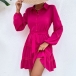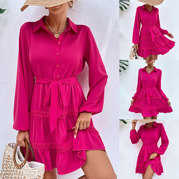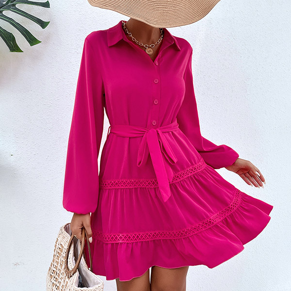 Look at this rose red dress! Crafted with high-quality fabric, this dress offers a comfortable and flattering fit. Featuring a stand collar and long sleeves, this dress exudes a chic and polished vibe. The buttoned and tiered detailing adds visual interest and creates a unique focal point. The self-tie waist belt accentuates your waistline and creates a flattering silhouette. Hope you like it.