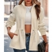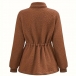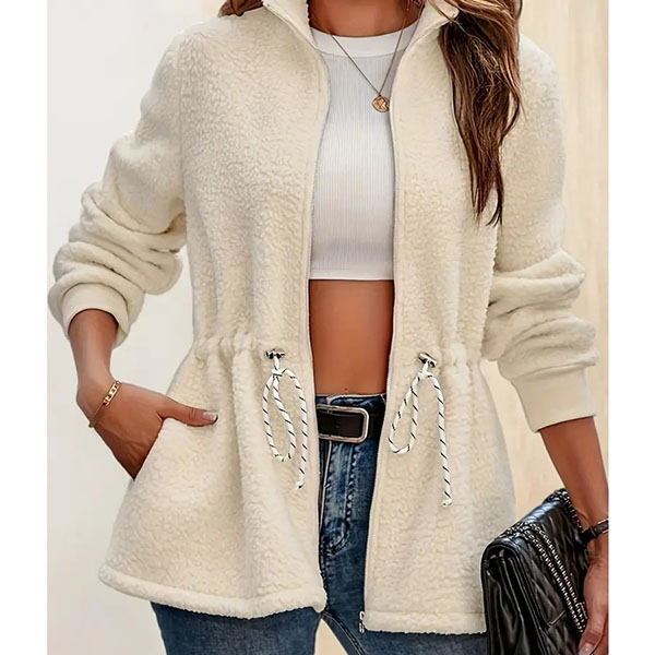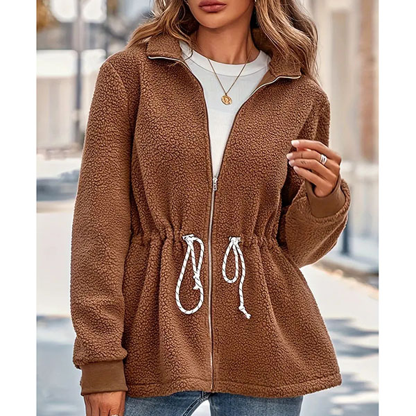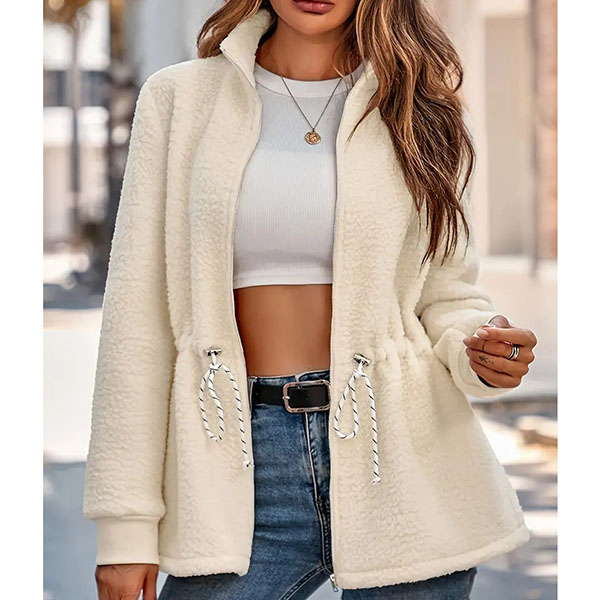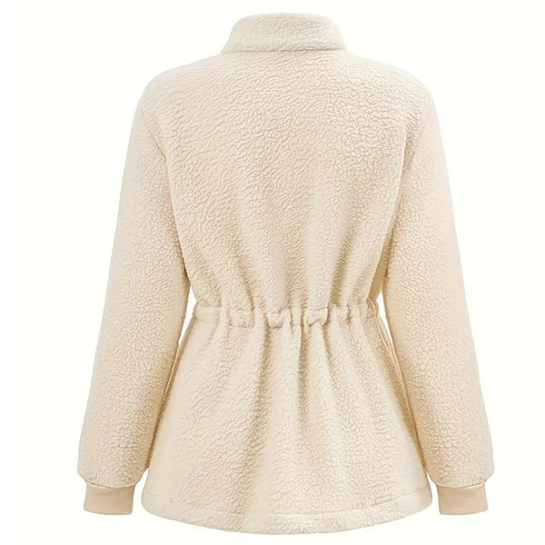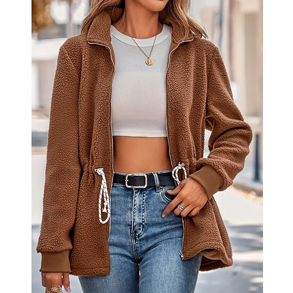 Fashion Solid Color Stand Collar Long Sleeve Drawstring Waist Plush Jacket