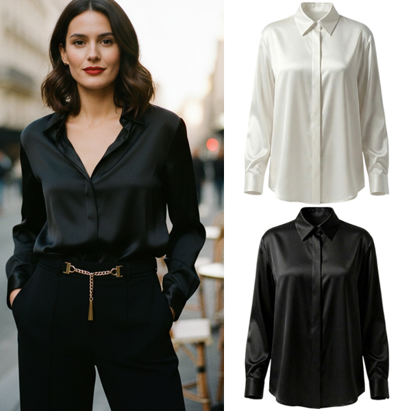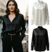 This blouse features elegant stand collar styling with refined fly front closure and luxurious satin construction for contemporary professional elegance. Perfect for professional occasions, business styling, or sophisticated formal coordination. Multi-colors avabile.