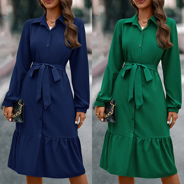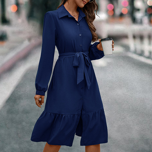 Fashion Solid Color Stand Collar Long Sleeve Self-tie Buttoned Shirt Dress