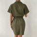 Fashion Solid Color Stand Collar Short Sleeve Buttoned Cinch Waist Mini Dress