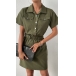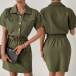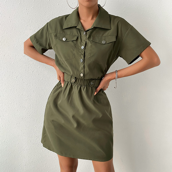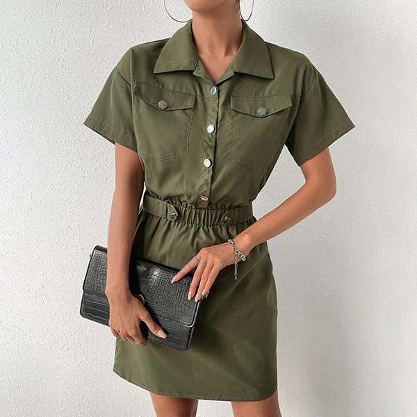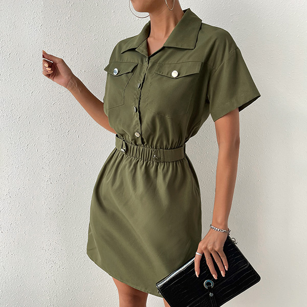 Green dress features a stand collar, front buttoned, short sleeve, patch chest pockets, elastic cinch waist, and mini length. And the solid color design offers a timeless and sophisticated appeal. Is it your style?
