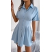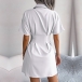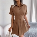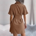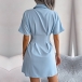Fashion Solid Color Stand Collar Short Sleeve Buttoned Cinch Waist Mini Shirt Dress