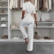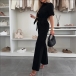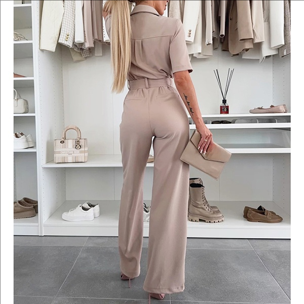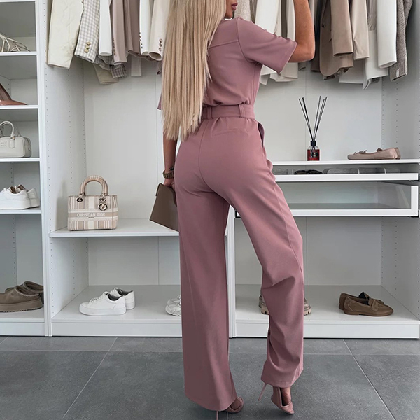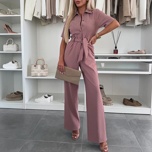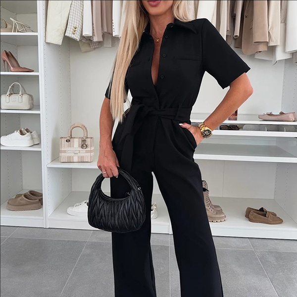 Elevate your wardrobe with this fashion straight-cut jumpsuit! Featuring a chic stand collar and short sleeves, this jumpsuit offers a polished yet comfortable look. The front button detail and self-tie waist create a flattering silhouette, making it perfect for both casual outings and more formal events. Pair with heels or flats for a versatile ensemble.