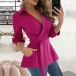 Fashion Solid Color Stand Collar V-neck Long Sleeve Self-tie Shirt with Side Pockets