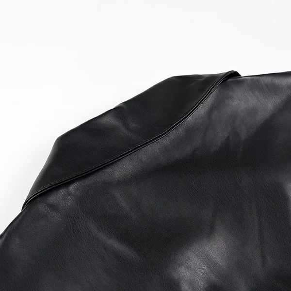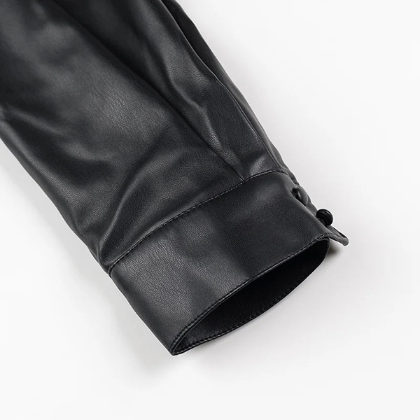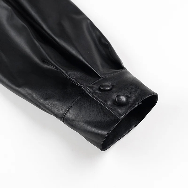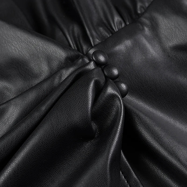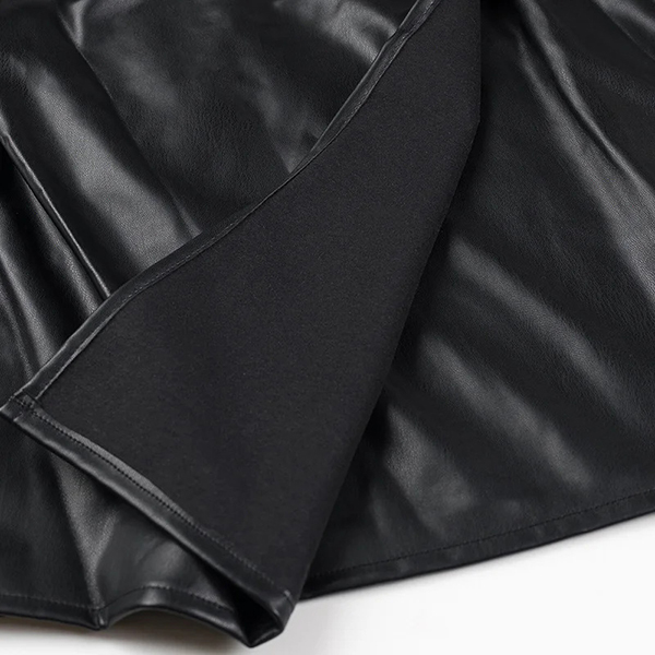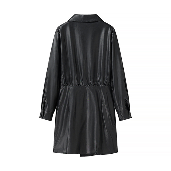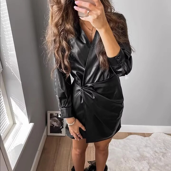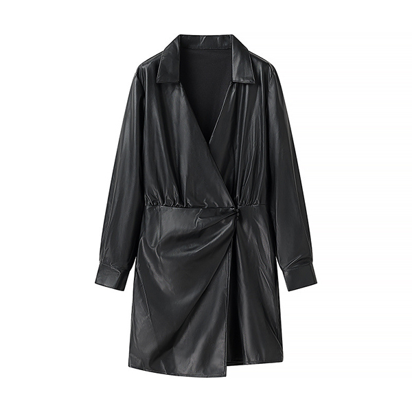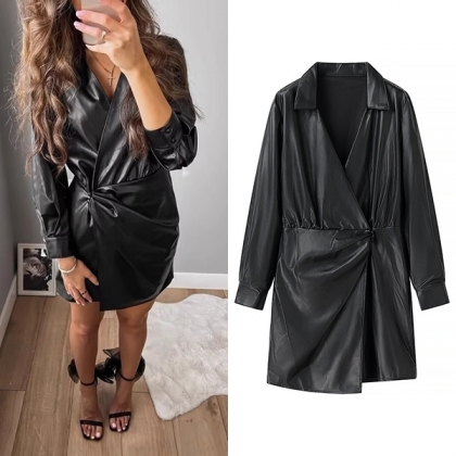 This edgy leather-look dress combines striking design details for standout style. The unique collar features both stand collar and V-neck elements for contemporary edge. Perfect for evening occasions, parties, or daily wear.