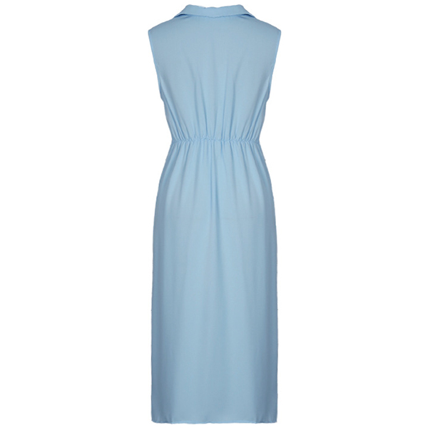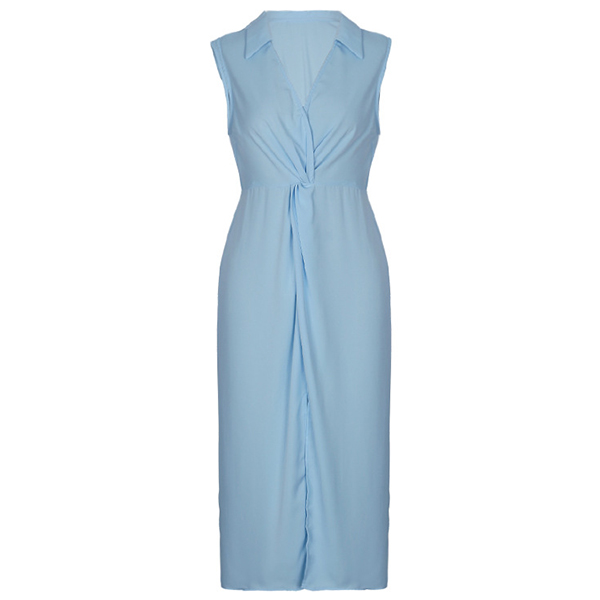 Fashion Solid Color Stand Collar V-neck Ruched Sleeveless Slit Dress