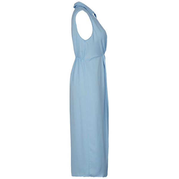 This dress features a solid color design, stand collar, V-neckline, ruched detailing, sleeveless silhouette, and a high slit for a fashionable and elegant look. Crafted with high-quality and comfortable materials, it offers both style and comfort. Wanna have a try?