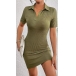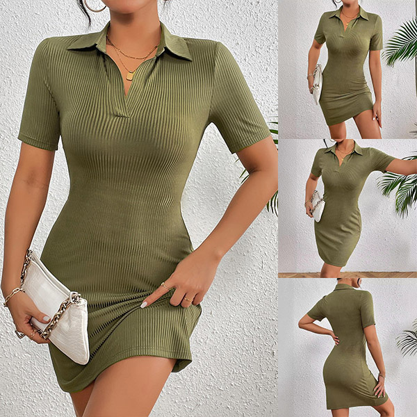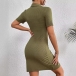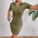 Fashion Solid Color Stand Collar V-neck Short Sleeve Ribbed Dress
