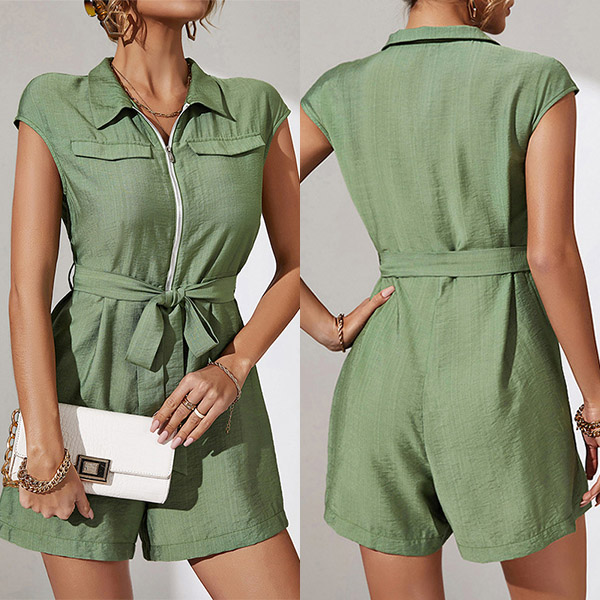This romper has a stand collar and a V-neckline with a zipper closure, creating a sophisticated and trendy look. The short sleeves are designed to be comfortable and breezy, perfect for warmer weather. Wanna have one?
