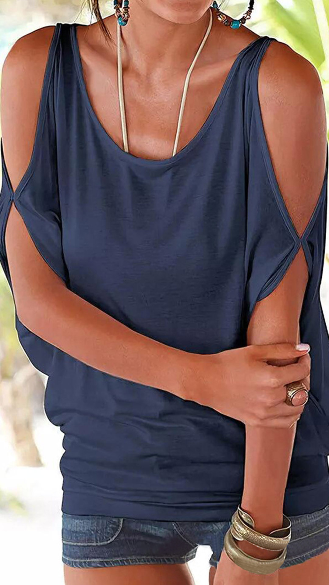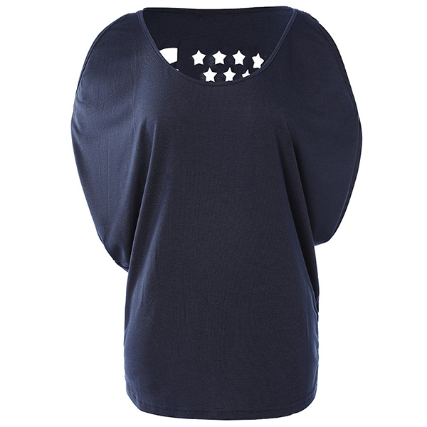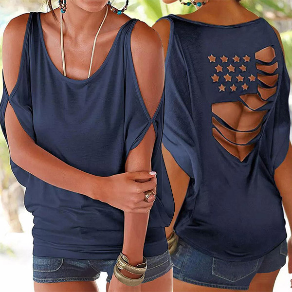 This fashion shirt is a solid color with a star and stripes hollow out design. The round neck and open shoulder shirt is casual and chic! Wanna have a try?