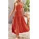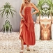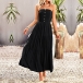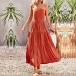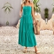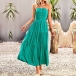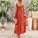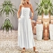 This dress is a must-have for any stylish wardrobe. The strapless design allows you to show off your shoulders and provides a relaxed and breezy feel, while the buttoned details create a unique and stylish look. The tiered midi-length design creates a beautiful flowy silhouette that is both feminine and flattering. It is versatile and perfect for a variety of occasions, from a day out to a summer party.
