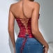 This shirt features a strapless neckline, a tie detail, and a solid color design. It is sexy and chic.