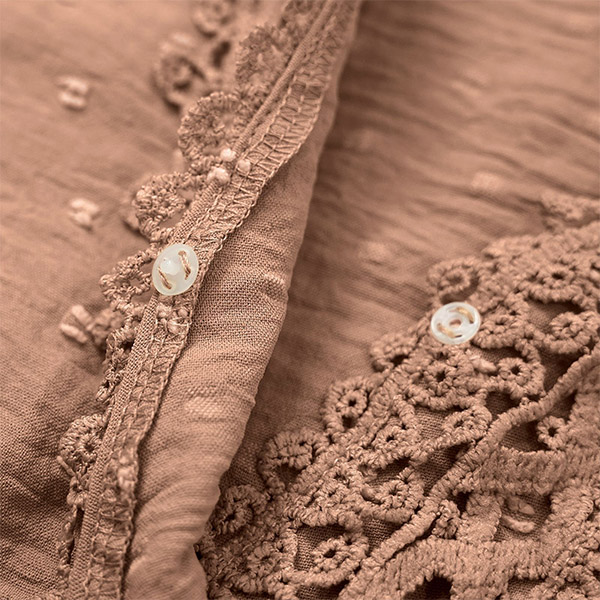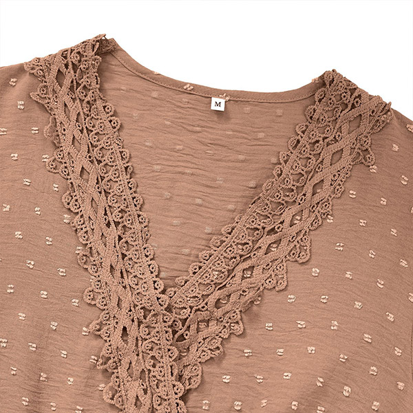 This dress is the epitome of fashion and elegance. Crafted from high-quality fabric, it offers a comfortable and luxurious feel. The Swiss-dot and lace splicing along the V-neck adds a delicate and romantic touch, while the tiered design adds movement and dimension to the dress, giving it a graceful and ethereal feel.