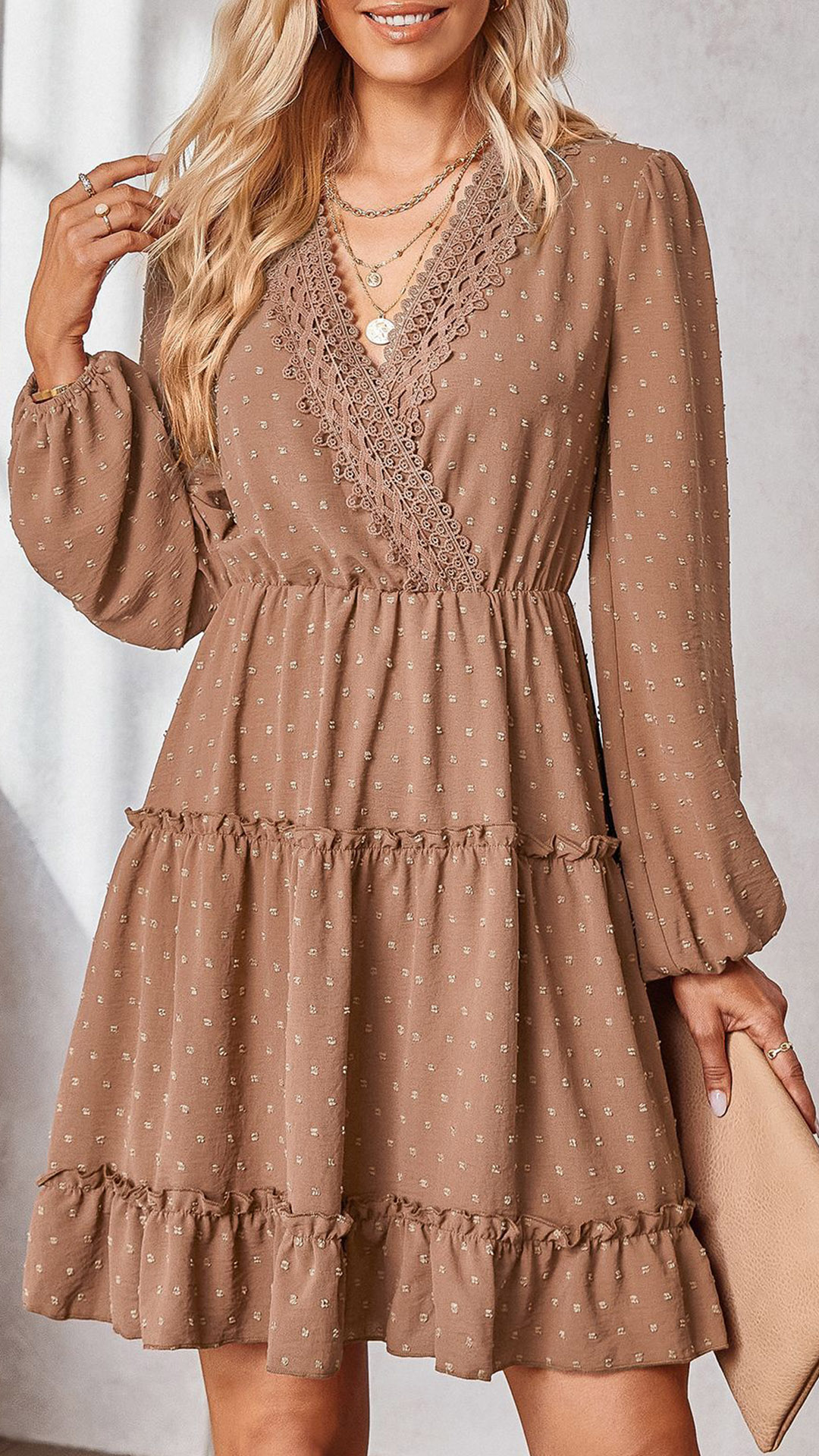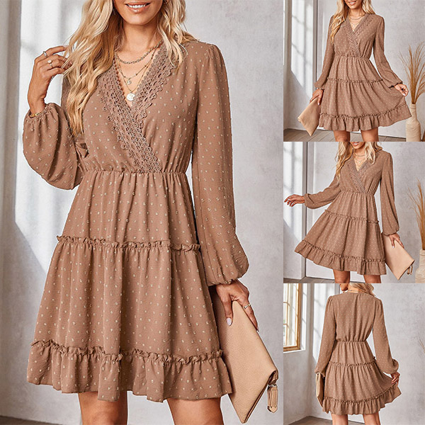 Fashion Solid Color Swiss-dot Lace Spliced V-neck Long Sleeve Tiered Dress