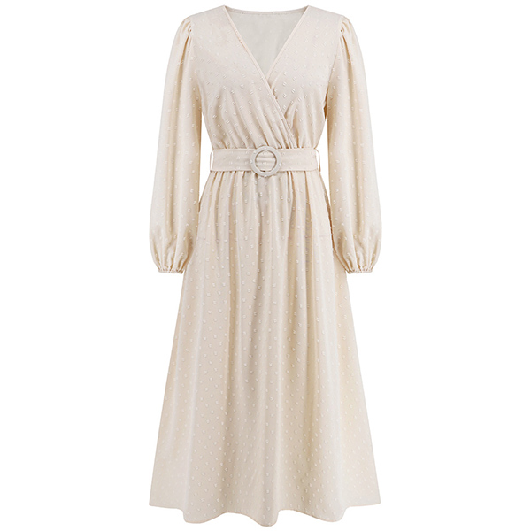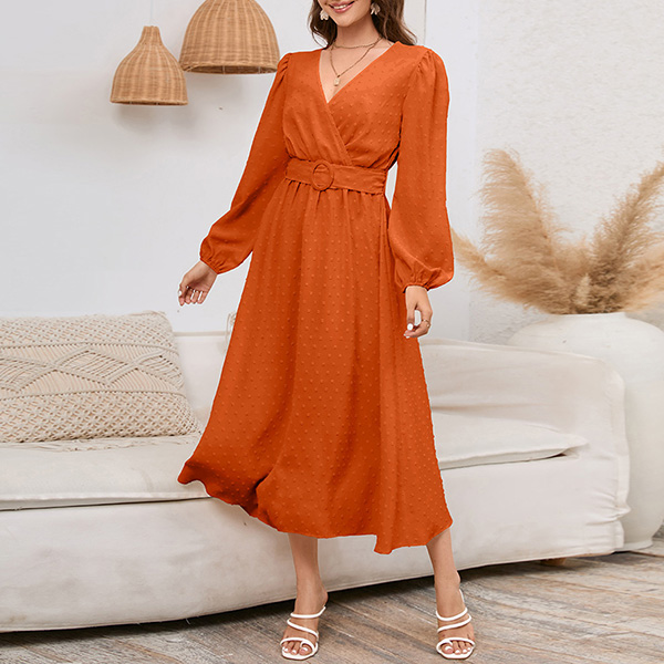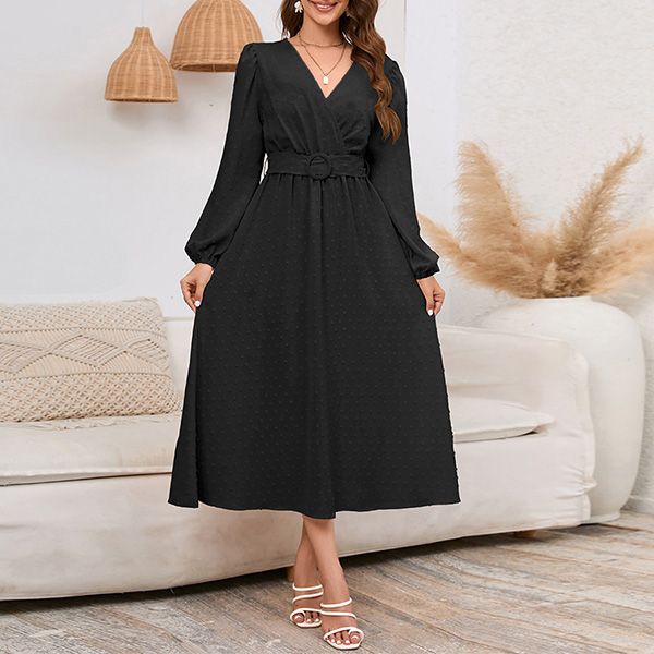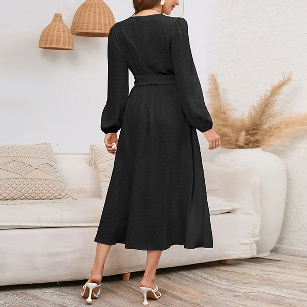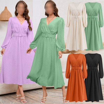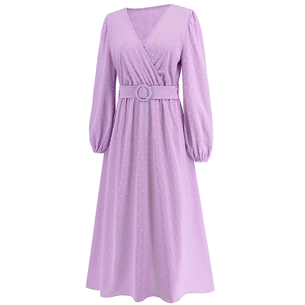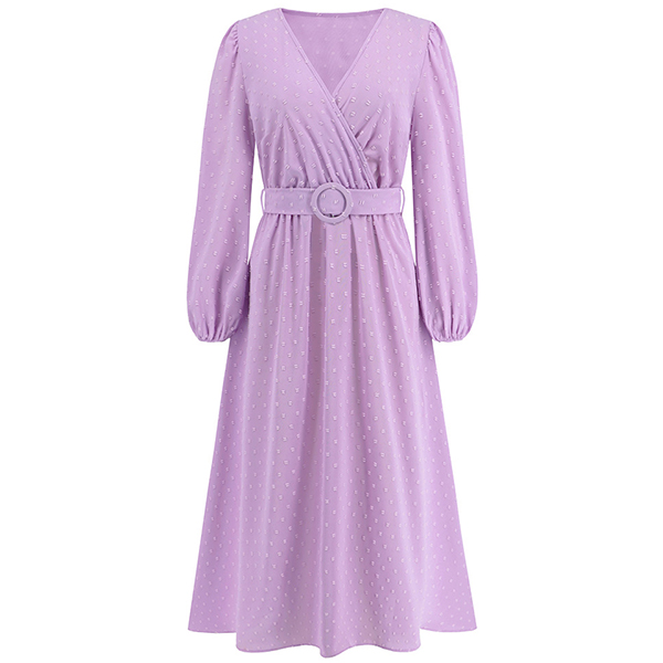 Fashion Solid Color Swiss-dot V-neck Long Sleeve Midi Dress with Belt