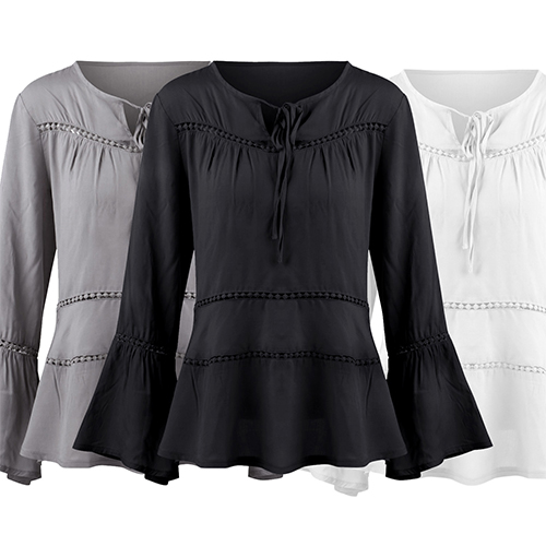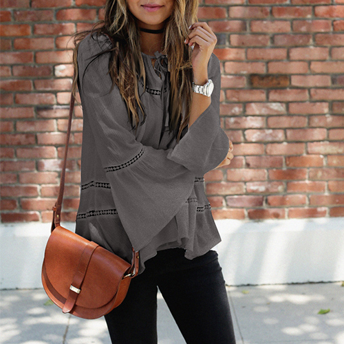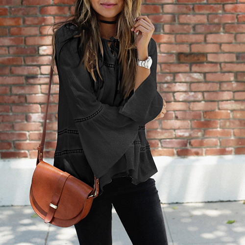 lace spliced details and trumpet sleeve design make this piece more appealing. Perfect for matching it with your tight pants.