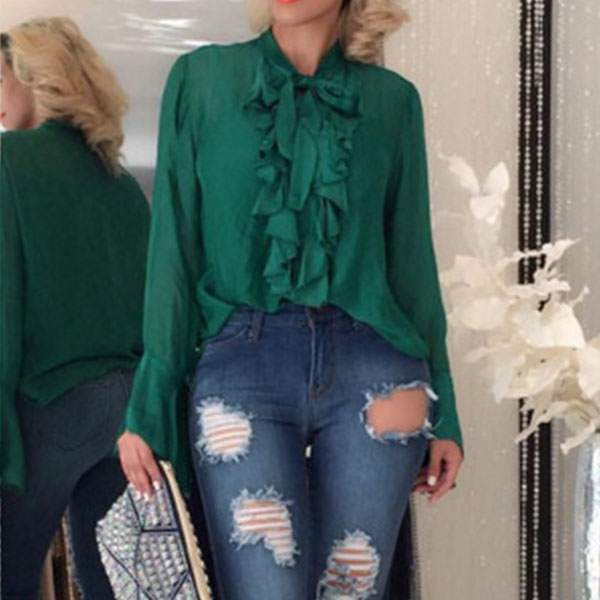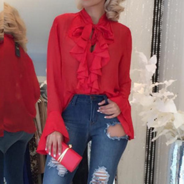 Be an elegant and charming office lady with the help of this chiffon blouse. Solid color style,its trumpet sleeve and ruffle design