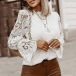 Fashion Solid Color Trumpet Sleeve Stand Collar Lace Top