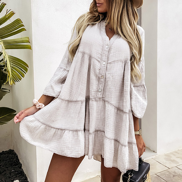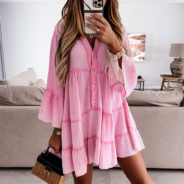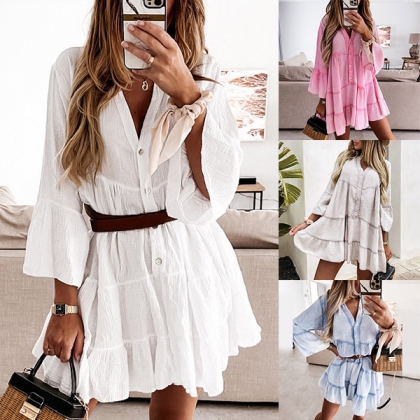Fashion Solid Color Trumpet Sleeve V-neck Ruffle Hem Loose Dress