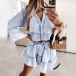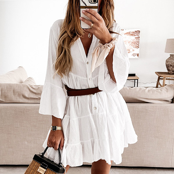 For your daily out or street shoot,you can trust in this dress to exude your style and personality. The trumpet sleeve,v-neck and ruffle hem design can lend you a dash of sweet and stylish vibes. You can add a waistband to showcase your waistline as well as achieve for a more stylish look.
