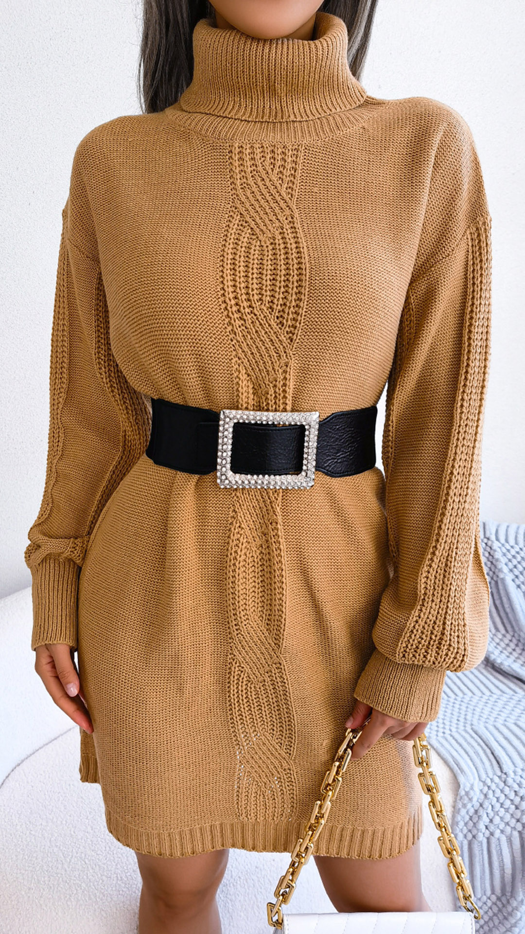 Made from a soft and cozy material, this dress will keep you warm all day long. It features a turtle neck design and long sleeves that will make you look chic and stylish. Whether you're headed to a casual lunch or a formal event, this dress is sure to turn heads!